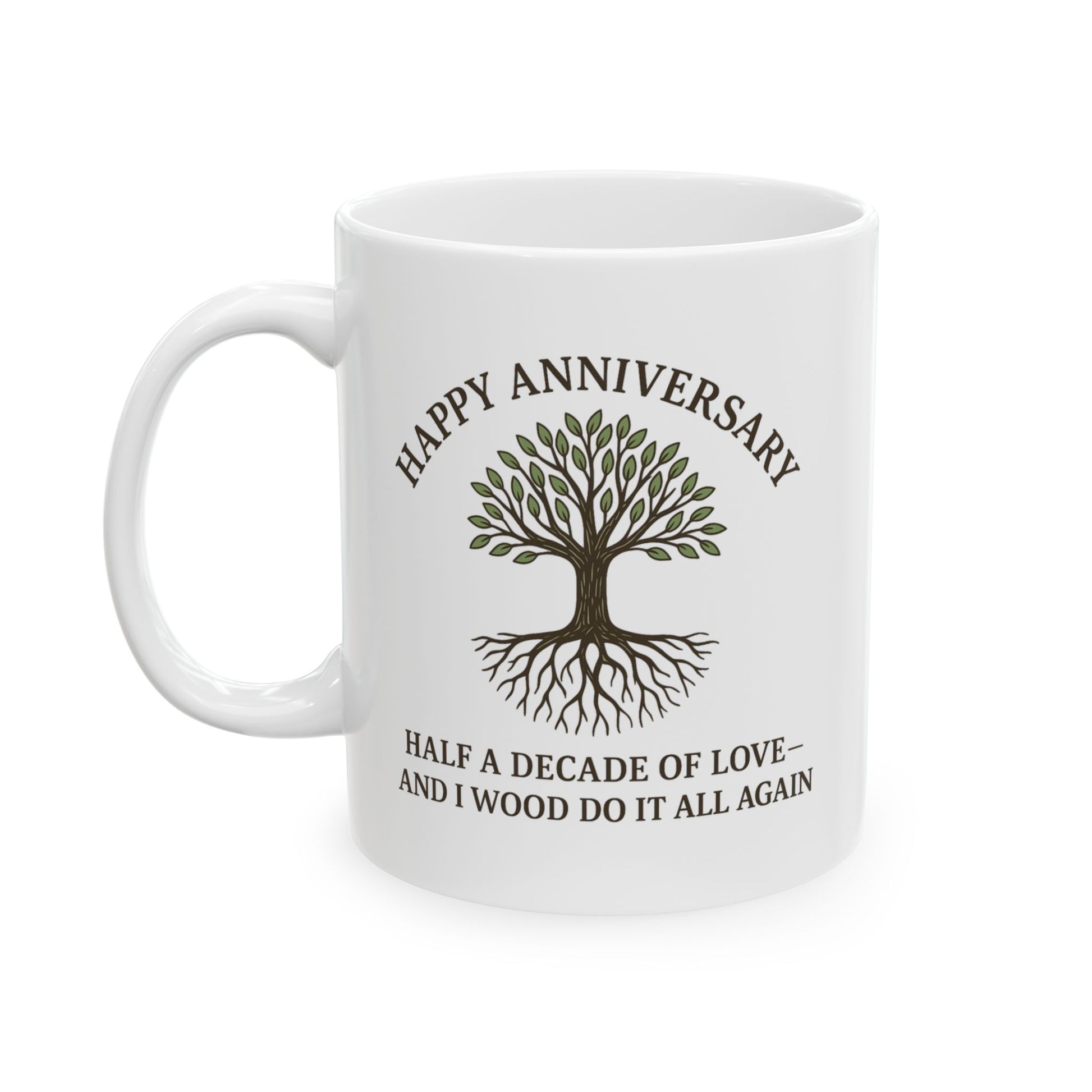 Featuring a hand-drawn tree with roots design and the sweet phrase “Half a Decade of Love – And I Wood Do It All Again”, it’s the perfect gift for your husband, wife, or couple celebrating their wood anniversary.