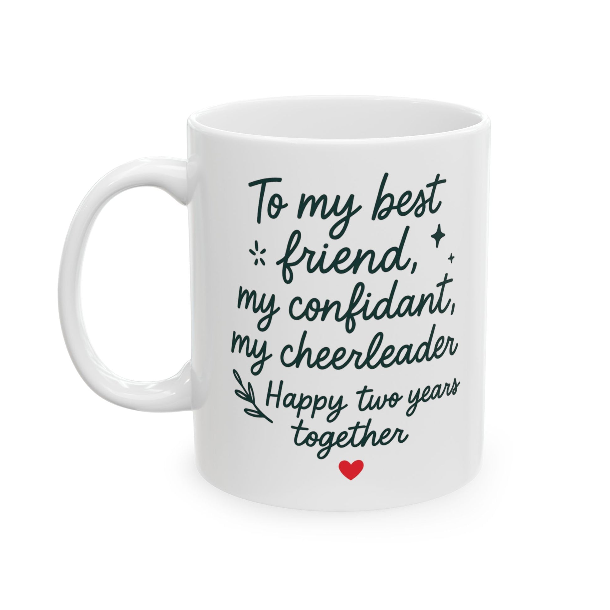 Featuring a handwritten-style design that reads “To my best friend, my confidant, my cheerleader — Happy two years together” with a sweet red heart, this mug makes the perfect second anniversary gift. Whether for your partner, spouse, or significant other, it’s a daily reminder of love, friendship, and gratitude. Ideal for coffee, tea, or hot cocoa, this durable ceramic mug combines sentiment with practicality. A thoughtful keepsake for anniversaries, Valentine’s Day, or just because.