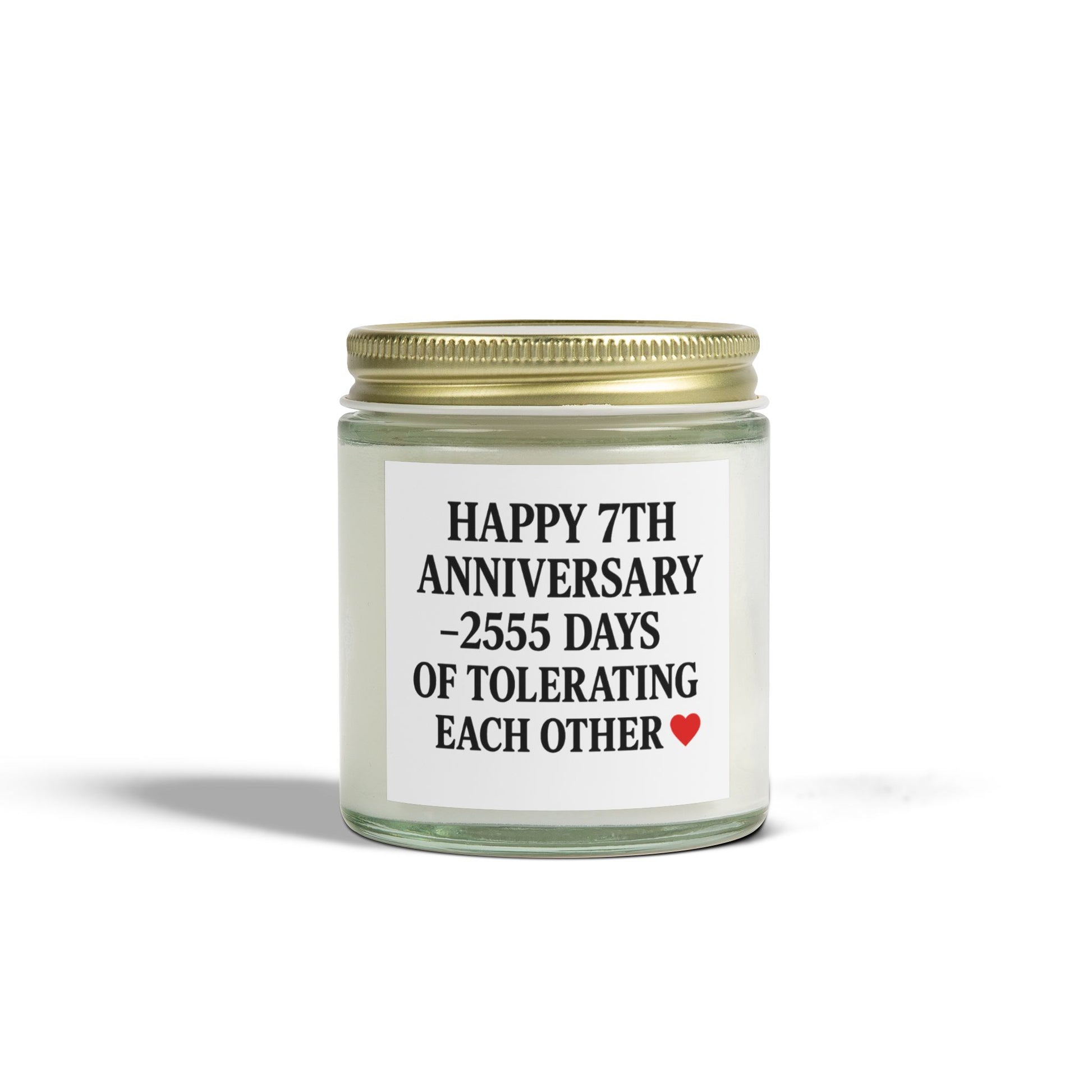 This funny 7th anniversary candle celebrates seven years (or 2555 days) of love, patience, and tolerating each other. Featuring bold black text with a playful red heart, it’s the perfect mix of romance and humor. Great as a unique anniversary gift for your spouse or partner, this candle adds a warm glow to your home while reminding you both that true love is equal parts passion and patience. Whether lit during dinner, a cozy night in, or just displayed proudly, it’s a memorable way to mark your 7th wedding anniversary.