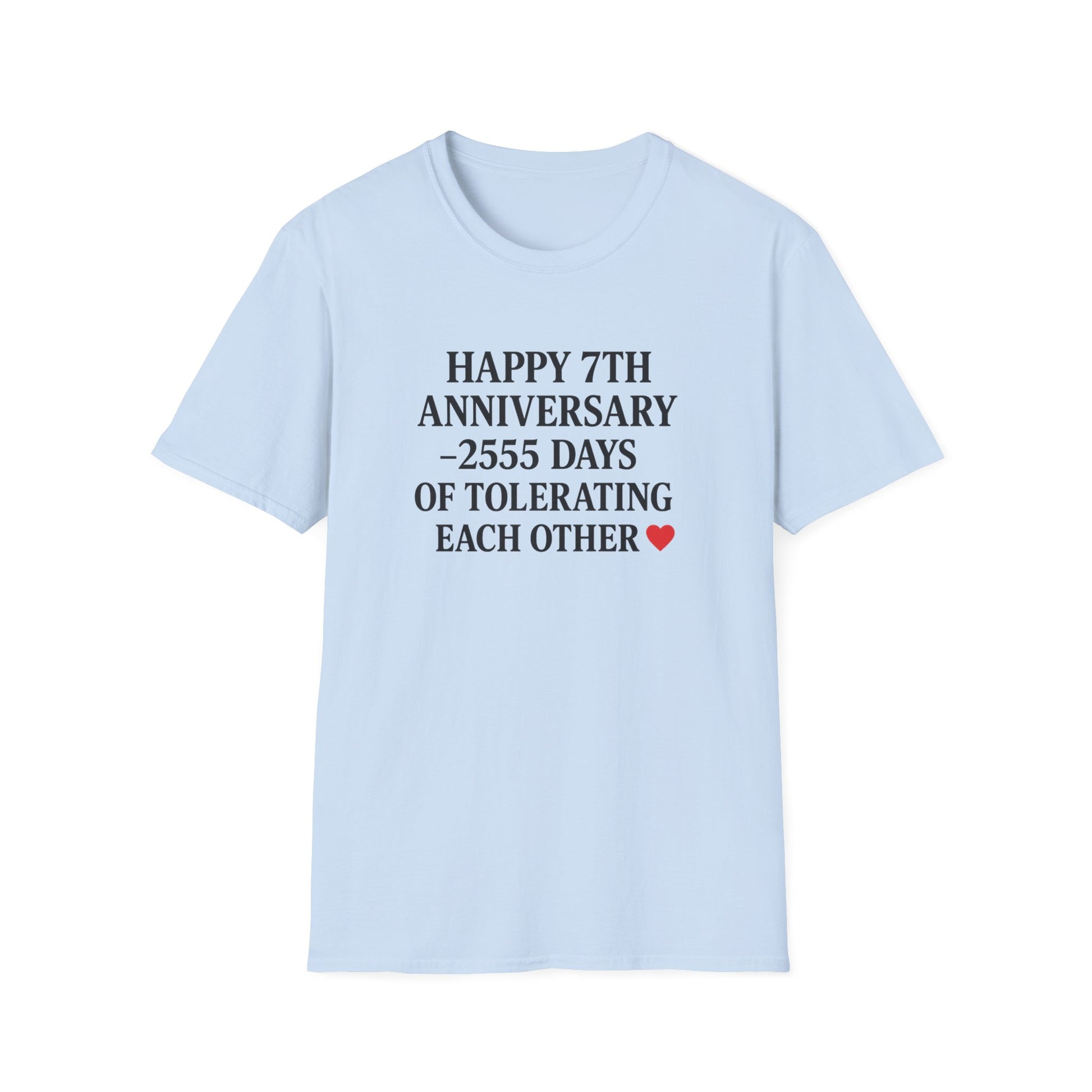 This funny 7th anniversary t-shirt highlights the reality of seven years (or 2555 days) of marriage — love mixed with plenty of patience. Featuring bold black text and a cheeky red heart, it’s the perfect balance of romance and humor.