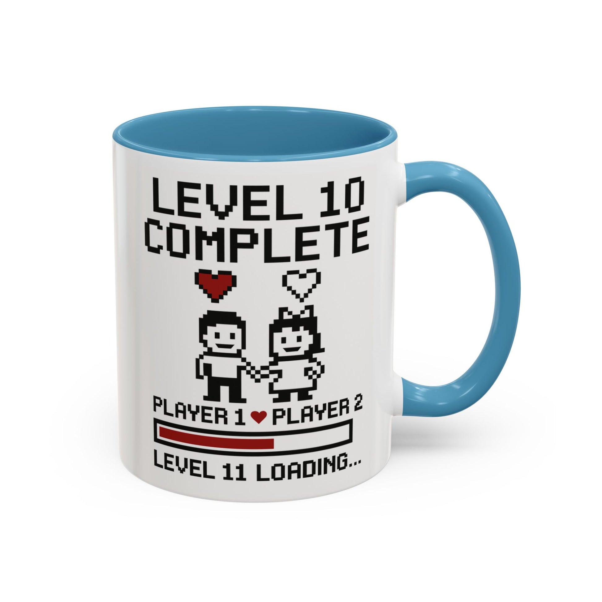 Featuring adorable pixel art of Player 1 and Player 2 holding hands, this “Level 10 Complete, Level 11 Loading…” design is the perfect way to mark your 10th wedding anniversary or relationship milestone. Whether you’re gaming partners, adventure buddies, or just love to laugh together, this mug is a daily reminder that every new level is better when played as a team.