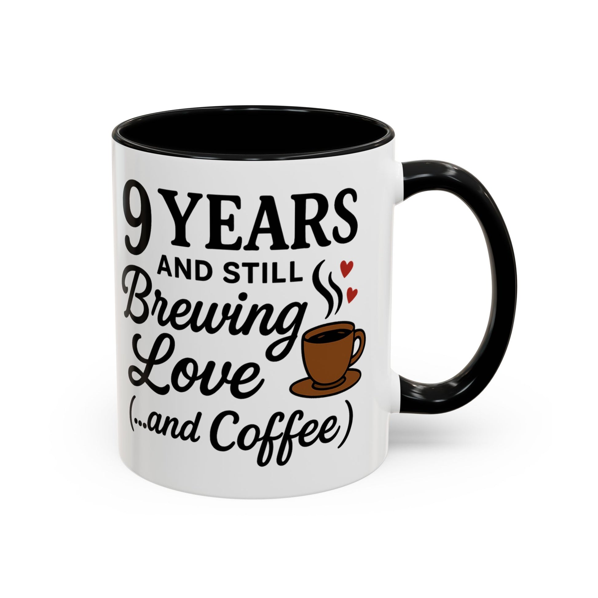 This “9 Years and Still Brewing Love (…and Coffee)” mug is the perfect blend of humor and romance. Featuring a cute coffee cup with red heart steam, this design is ideal for couples who’ve shared countless cups of coffee (and love) over the years.