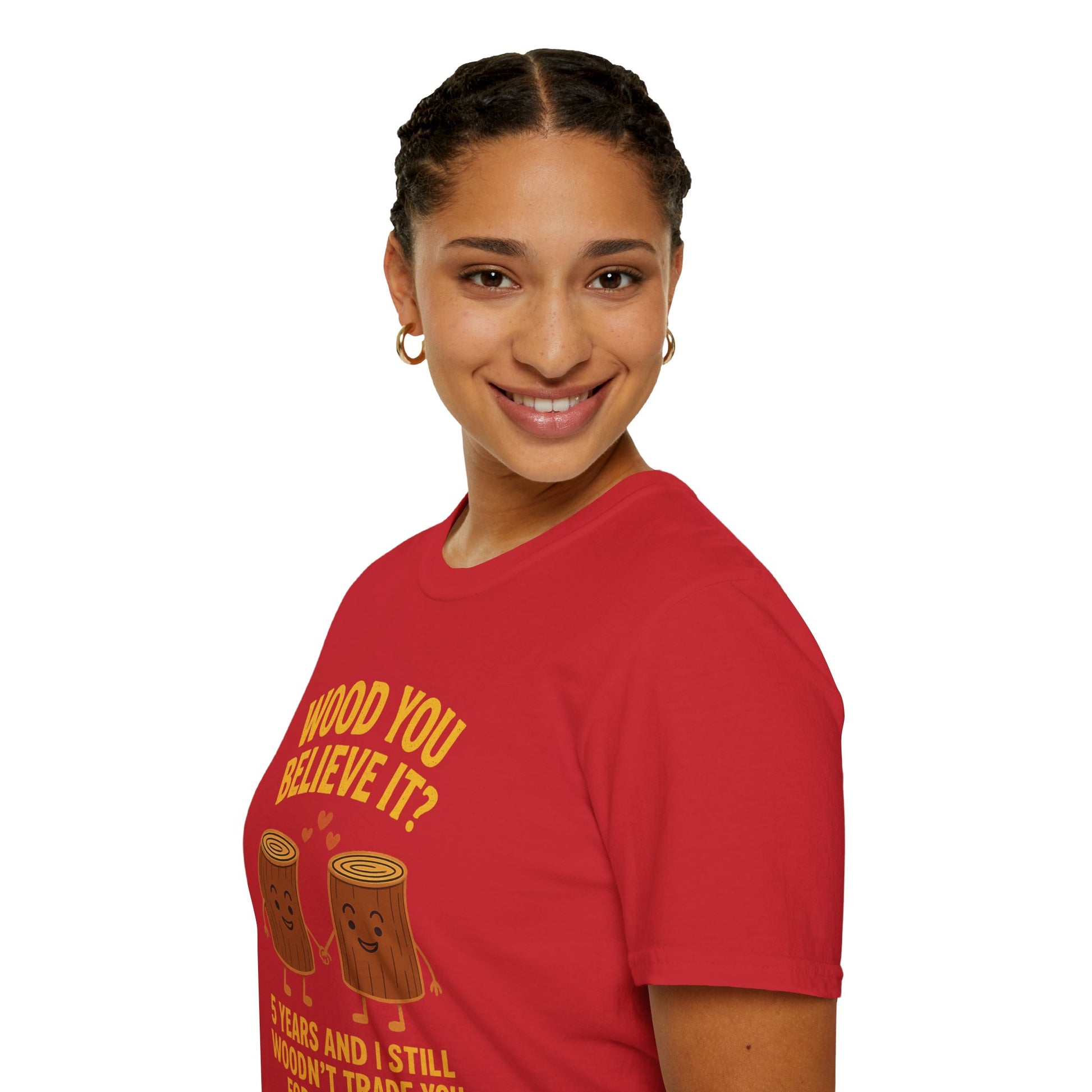 This adorable wood anniversary t-shirt is more than just a gift — it’s a symbol of the roots you’ve grown and the joy you’ve shared. The playful design features two smiling cartoon logs holding hands with little red hearts above — a sweet reminder that after 5 years, your love is still strong, warm, and full of fun. Every time it’s worn, it will spark a smile, a memory, or even happy tears — making it the perfect keepsake for your 5th wedding anniversary. Whether gifted to your spouse, husband, wife, or a beloved couple, this shirt celebrates love in its truest, most joyful form.